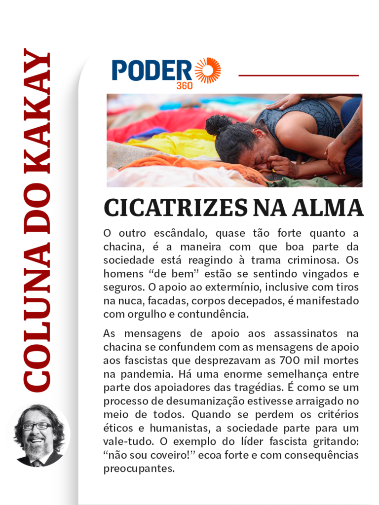 E não é “apenas” o não repúdio e o não apoio que chocam. É muito mais. É o engajamento no horror. É a solidariedade obtusa às arbitrariedades e aos crimes. O responsável maior pela operação, o governador do Estado Cláudio Castro, subiu 10 pontos na primeira pesquisa após a chacina. E no primeiro dia ganhou 1 milhão de seguidores nas redes sociais. Voltou ao jogo político. É a certeza de que outras operações sangrentas virão, outras mortes e outros assassinatos. É a comprovação óbvia de que a operação teve cunho eleitoreiro. Uma sociedade adormecida, cega e ávida por violência. É, infelizmente, o medo de estarmos perdendo a hipótese de podermos viver numa sociedade mais humana, minimamente igual e justa.