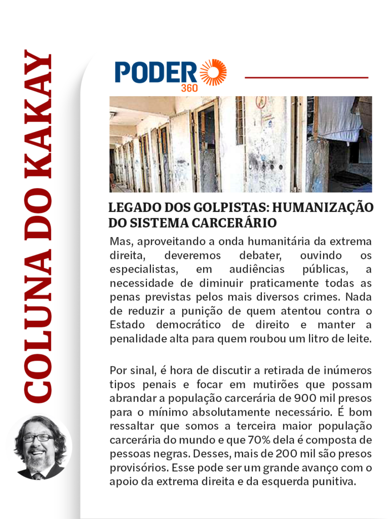 Mas, aproveitando a onda humanitária da extrema direita, deveremos debater, ouvindo os especialistas, em audiências públicas, a necessidade de diminuir praticamente todas as penas previstas pelos mais diversos crimes. Nada de reduzir a punição de quem atentou contra o Estado democrático de direito e manter a penalidade alta para quem roubou um litro de leite.