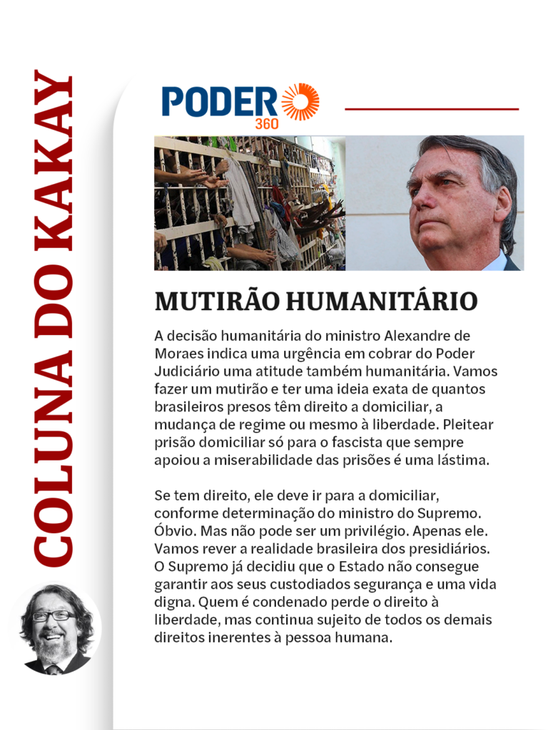 A decisão humanitária do ministro Alexandre de Moraes indica uma urgência em cobrar do Poder Judiciário uma atitude também humanitária. Vamos fazer um mutirão e ter uma ideia exata de quantos brasileiros presos têm direito a domiciliar, a mudança de regime ou mesmo à liberdade. Pleitear prisão domiciliar só para o fascista que sempre apoiou a miserabilidade das prisões é uma lástima.
