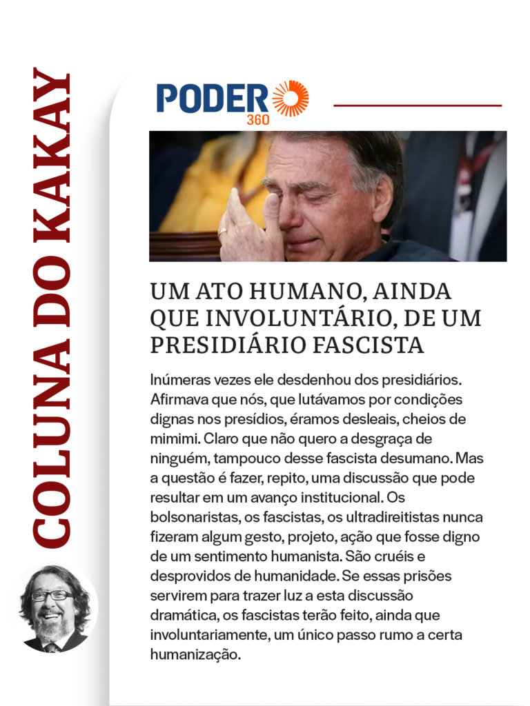 Inúmeras vezes ele desdenhou dos presidiários. Afirmava que nós, que lutávamos por condições dignas nos presídios, éramos desleais, cheios de mimimi. Claro que não quero a desgraça de ninguém, tampouco desse fascista desumano. Mas a questão é fazer, repito, uma discussão que pode resultar em um avanço institucional. Os bolsonaristas, os fascistas, os ultradireitistas nunca fizeram algum gesto, projeto, ação que fosse digno de um sentimento humanista. São cruéis e desprovidos de humanidade. Se essas prisões servirem para trazer luz a esta discussão dramática, os fascistas terão feito, ainda que involuntariamente, um único passo rumo a certa humanização.